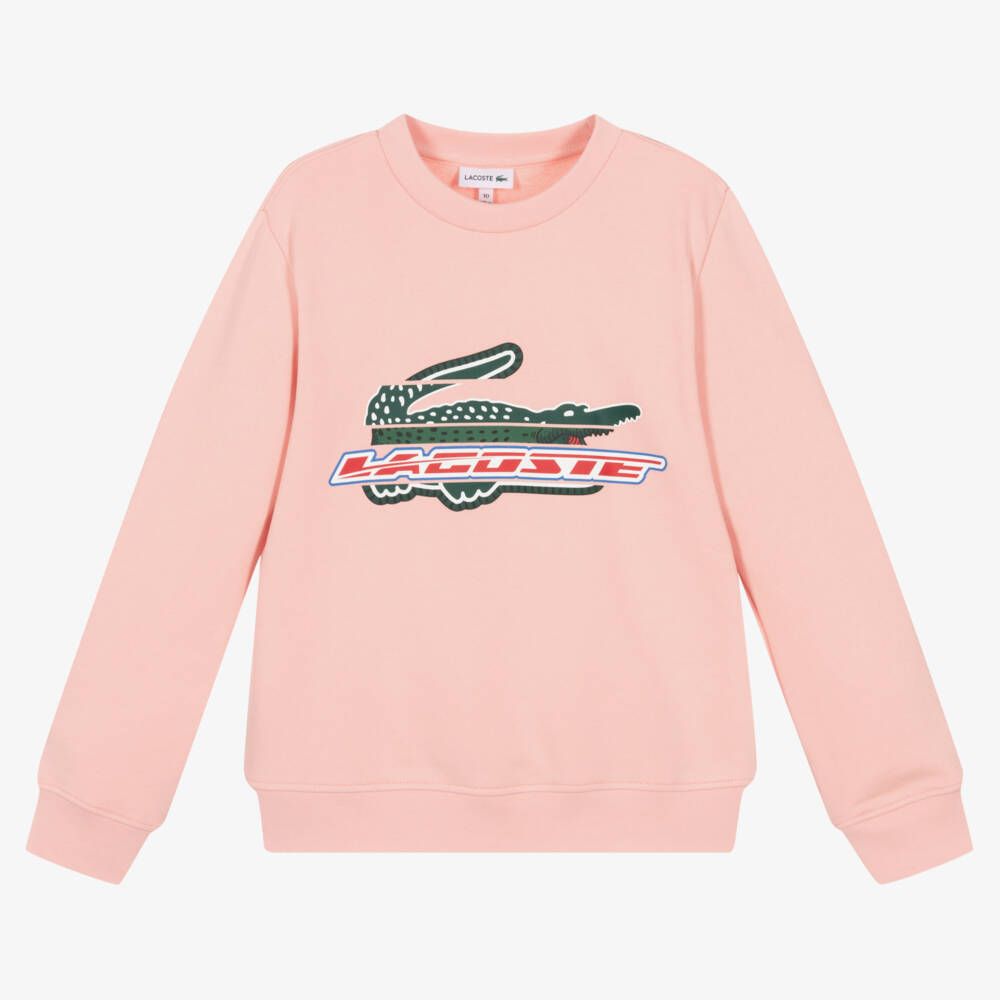 Pink sweatshirt for teen girls by Lacoste, with a bold graphic on the front incorporating the iconic green crocodile logo. Made from soft cotton jersey, this wardrobe essential has a crew neckline and casual ribbed trims for a warm, classic fit. The embroidered crocodile logo is sewn on the back of the neck for an added designer detail.