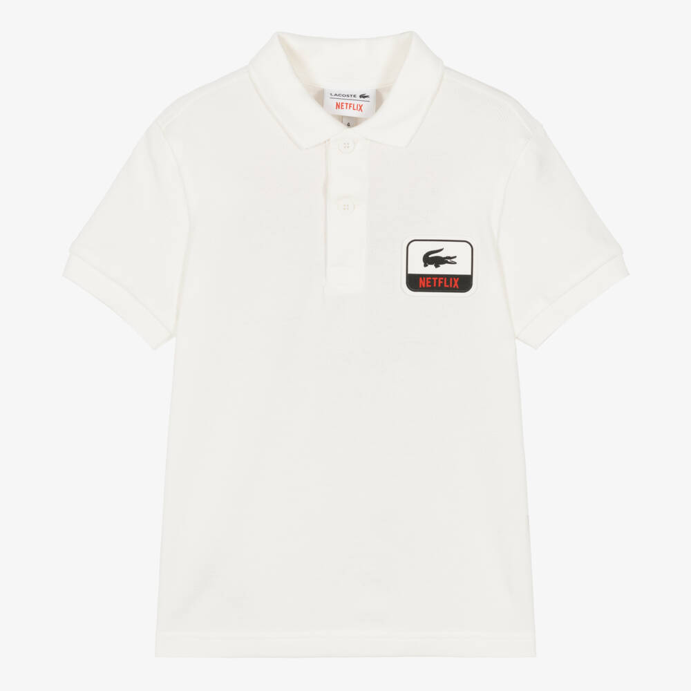 Off-white polo shirt for boys and girls by Lacoste, made in soft organic cotton piqué. Part of the Netflix collection, this sporty-style polo shirt has a rubberised logo patch on the chest incorporating the iconic crocodile and a large Netflix menu print on the back for instant recognition.