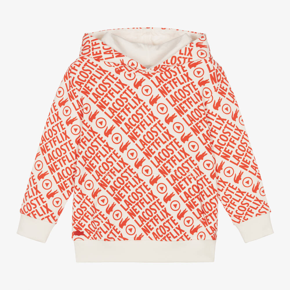 Cool off-white hoodie for boys and girls by Lacoste, made in mid-weight organic cotton jersey. Classically styled with ribbed trims and a large pouch pocket on the front, it is easy and comfortable to wear. Part of the Netflix collection, it is printed with red logos with a play symbol and the iconic crocodile incorporated for an eye-catching finish.