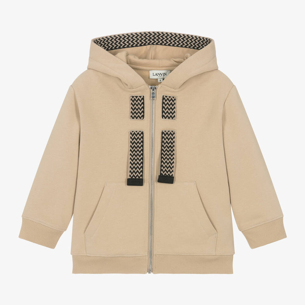 A cool zip-up hoodie for boys by French brand Lanvin, in a beige colourway with bold logo embroidery on the back. Made in organic cotton jersey, this mid-weight layering piece features black and beige herringbone 'Curb' trims for a signature look. It has a soft, fleecy feel on the inside and ribbed detailing on the cuffs and hem. Front pockets conveniently hold belongings.