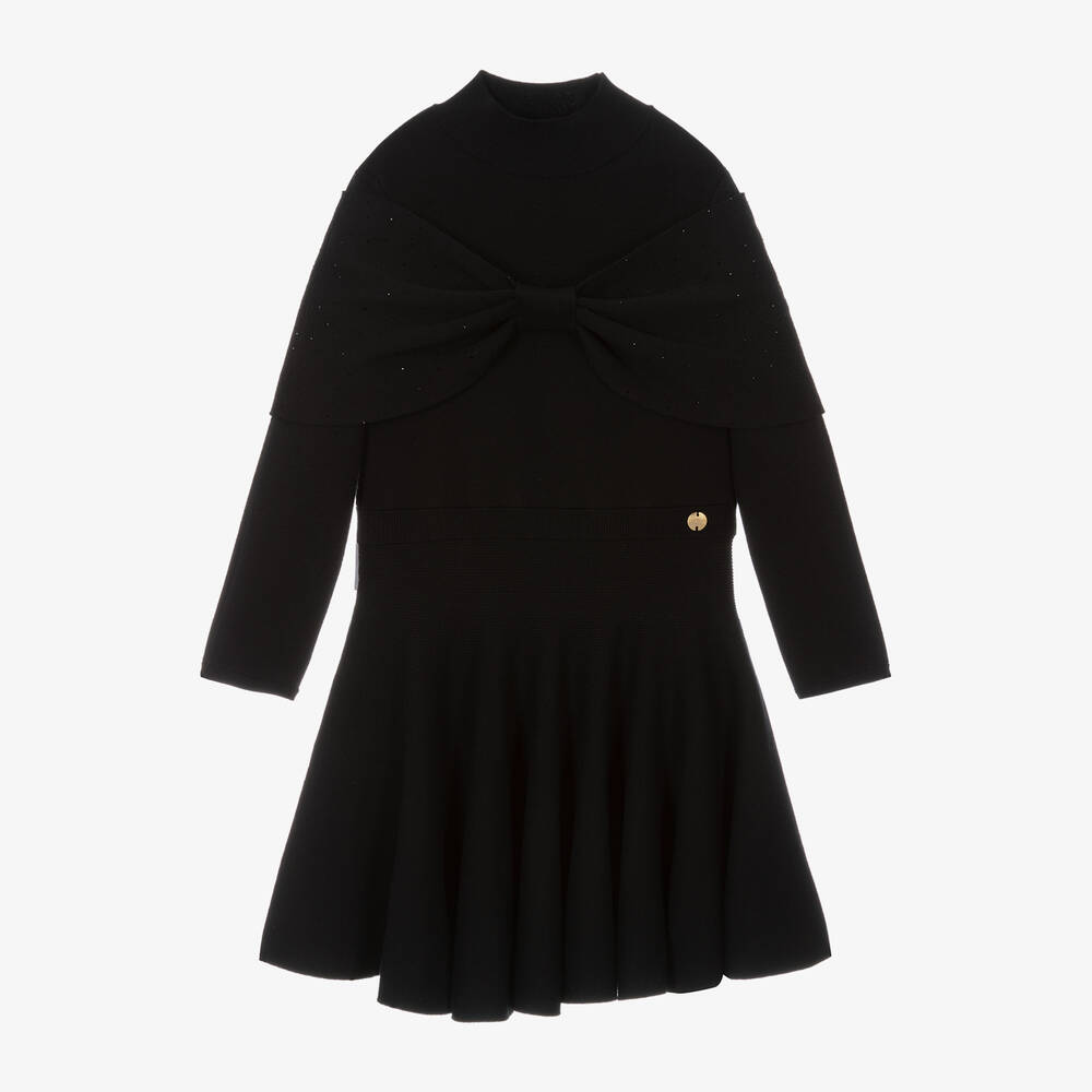 Black dress for girls by luxury French brand Lanvin, knitted in a stretchy, mid-weight viscose blend. A stylish fit and flare design, it has long sleeves and a wide fixed bow over the shoulders, decorated with sparkly black rhinestones and incorporating a logo on the back. A gold metal logo charm on the waist completes the designer look.