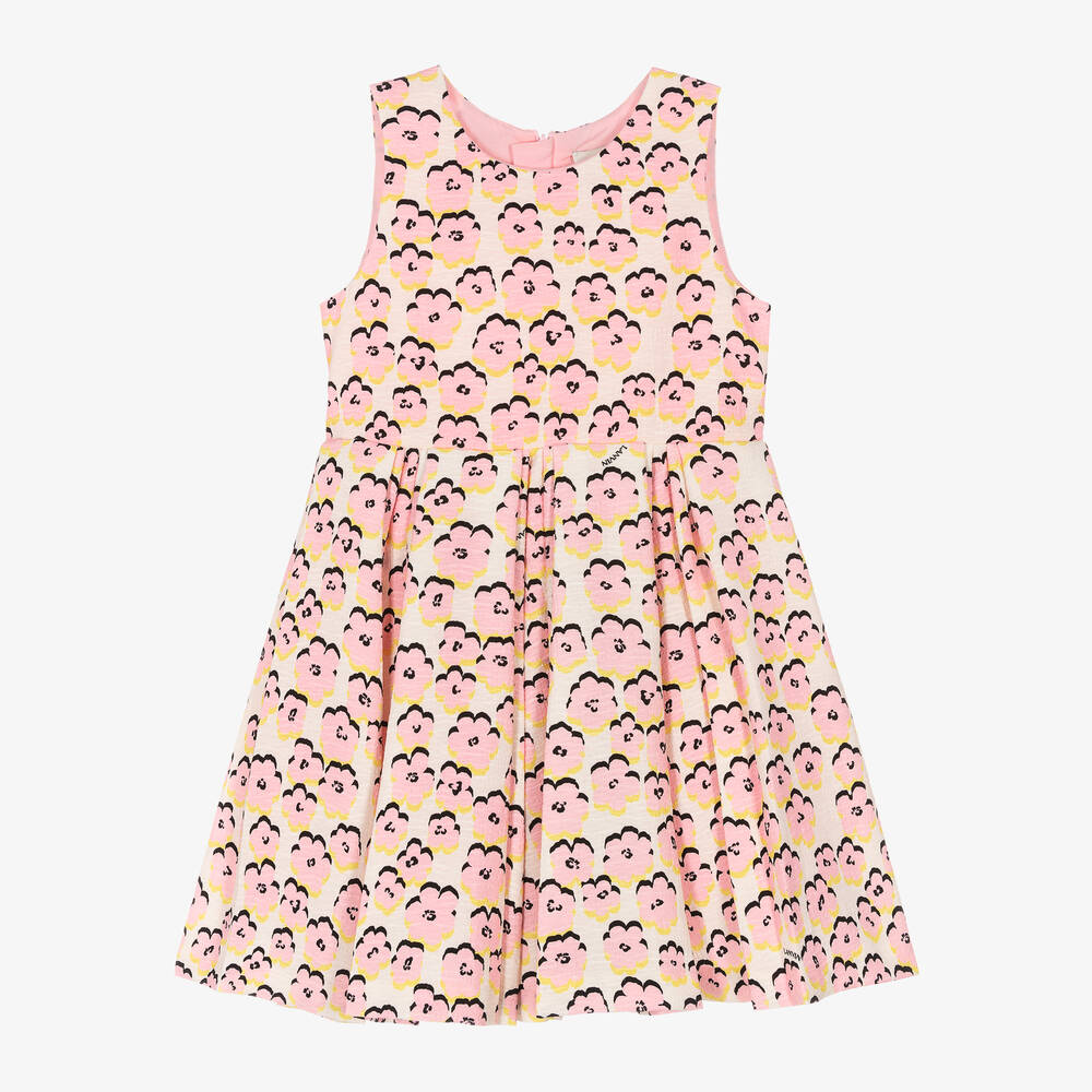 Lovely Mini-me ivory skater dress for girls by luxury French brand Lanvin. Made in a lightweight textured material, it has a pretty pink, yellow and black daisy pattern, interspersed with black logo prints. The pleated skirt has a lightweight viscose lining and layers of soft tulle for extra volume. This stylish sleeveless dress has a concealed zip fastening on the back.