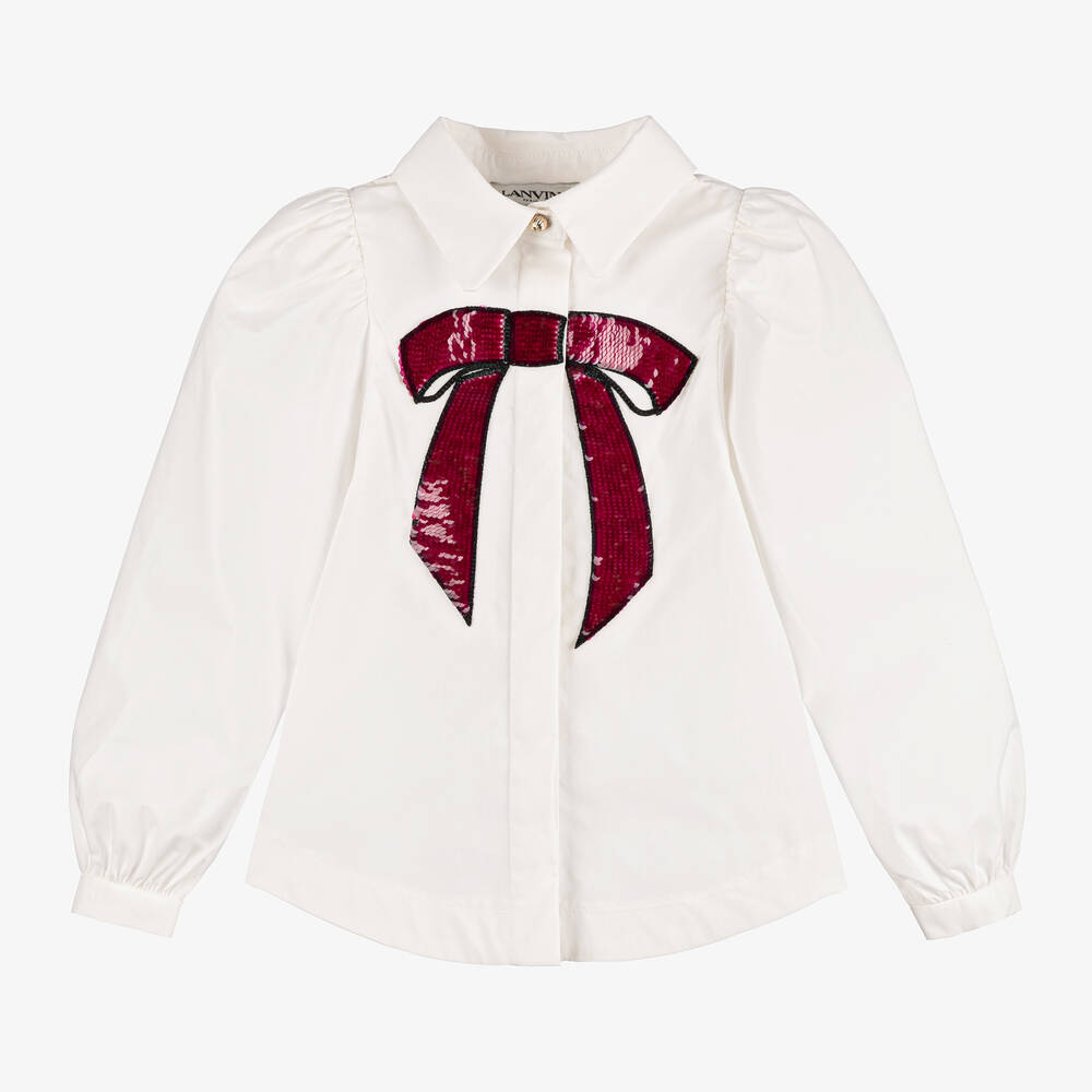 Stylish ivory blouse for girls by luxury French brand Lanvin, made in soft, smooth cotton poplin. With a lovely A-line shape and pretty puffed sleeves, it has an eye-catching pink sequin bow motif on the front and an understated embroidered logo on the back. It fastens with concealed buttons on the front and the brand's classic Arpège buttons on the cuffs and at the neck.