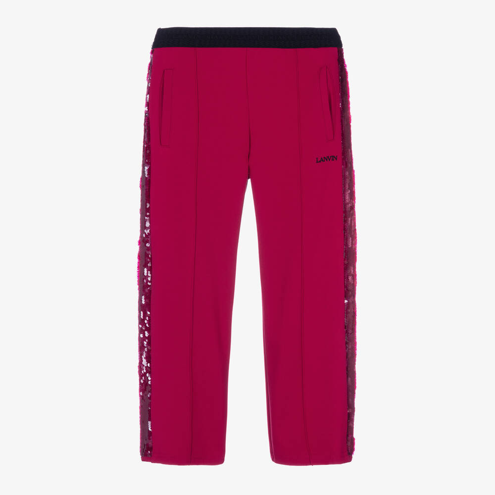 Fuchsia pink trousers for girls by luxury French brand Lanvin, made in soft viscose blend Milano jersey. Casual, but stylish, these fun trousers have sequin trims down the side of each leg. There are front and back pockets and an elasticated jacquard logo waistband. For a subtle designer finish, they have a small embroidered logo on the front.