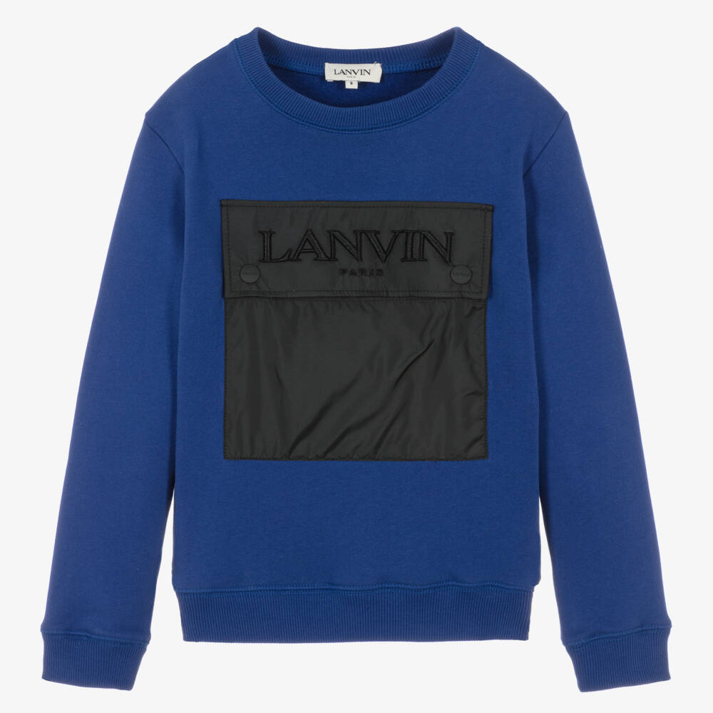 A blue organic cotton sweatshirt for teen boys by Lanvin, with a cool and contemporary feel. A large silky smooth, popper fastening black pocket is placed on the front, with a bold Lanvin Paris logo embroidered for a luxury touch. This jersey jumper comes in a crew neck style with ribbed trims.