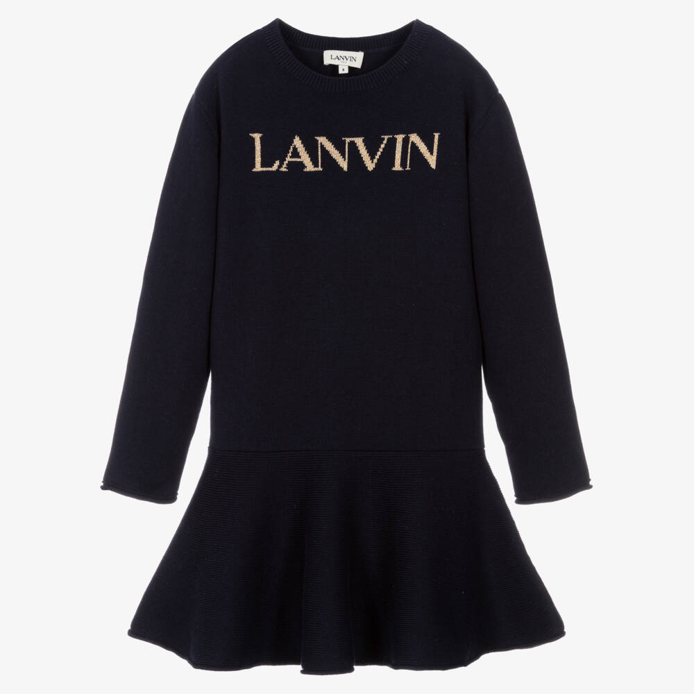 A casual navy blue dress for teen girls by Lanvin, with a glittery gold intarsia-knit logo. Ideal for keeping warm, this dress has a dropped waist with a contrasting horizontal knit. Made from a luxuriously soft cotton and wool blend, there are rolled hems on the sleeves and skirt.
