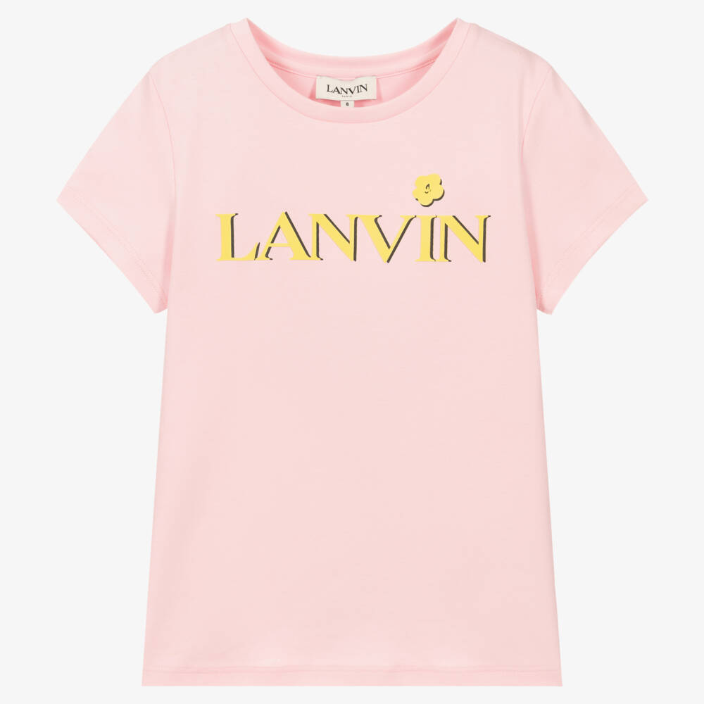 Pretty pale pink T-shirt for teen girls by luxury French brand Lanvin. It has an eye-catching bright yellow rubberised logo and daisy print on the front. Simple yet stylish, it is made in soft and comfortable cotton jersey.