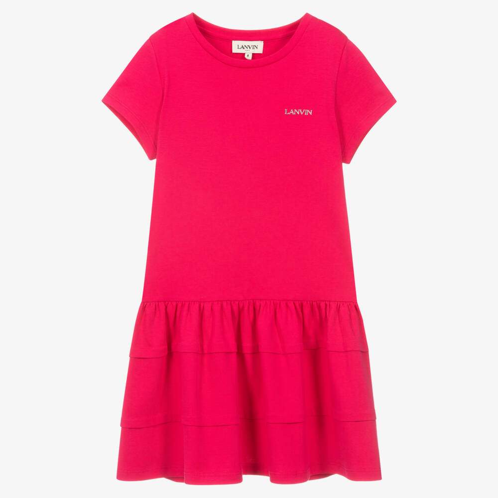 Bright fuchsia pink dress for teen girls by luxury French brand Lanvin, with a shiny silver logo printed on the chest. Simply stylish, it has a dropped waist, with a tiered skirt and is made in soft, comfortable cotton jersey.