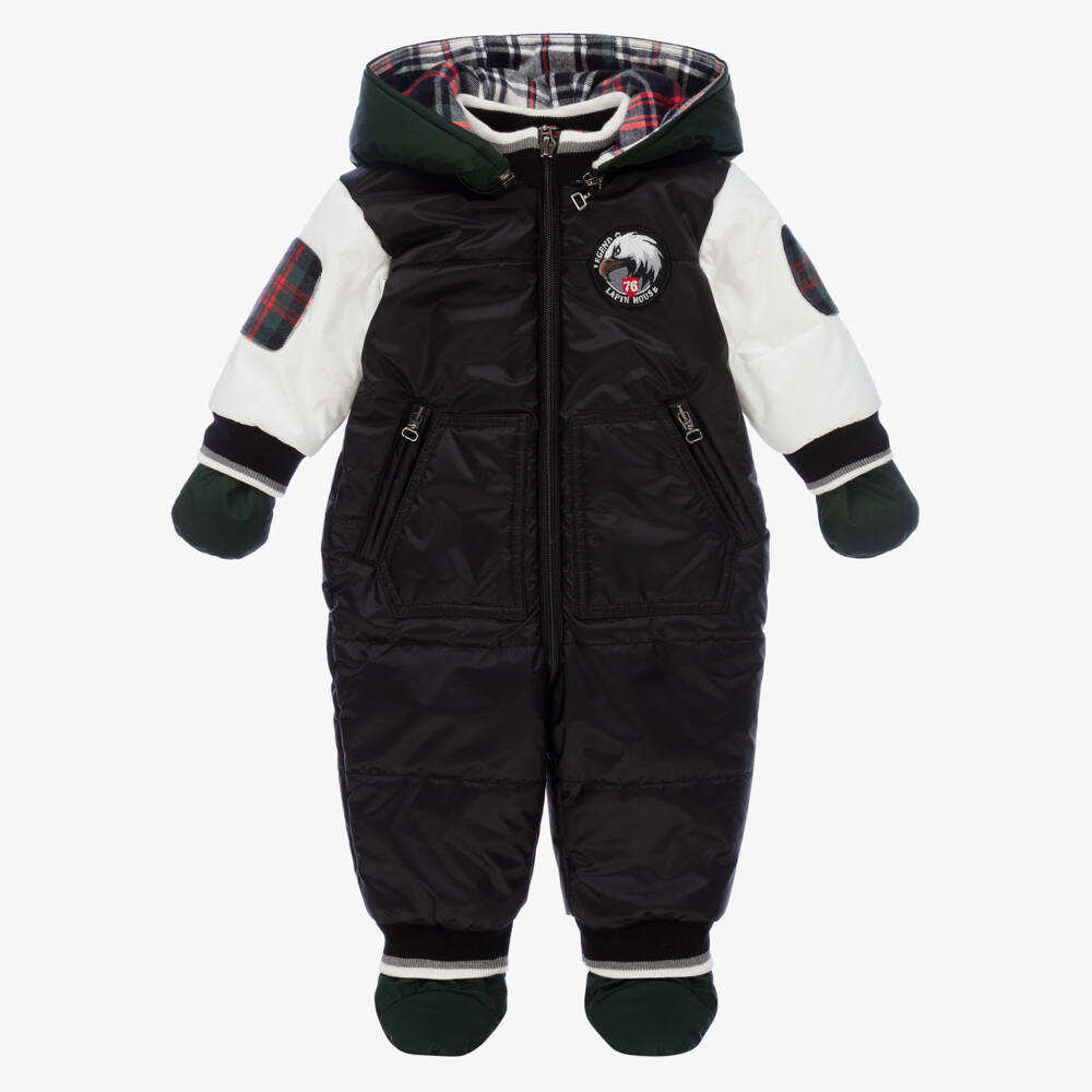 Baby boys black and white snowsuit by Lapin House, with detachable hood, mittens and booties in bottle green. Cosy with generous padding, it is soft and smooth with practical zip fastening front, pockets and hood. It has lovely red and green tartan trims, black, grey and white ribbed trims and an embroidered eagle badge on the chest.