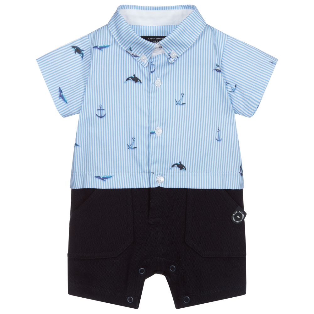 Baby boys shortie by Lapin House. The blue and white stripe top is made in lightweight poplin with an orca print, and button fastenings. The lower part is navy blue piqué, with buttons between the legs.