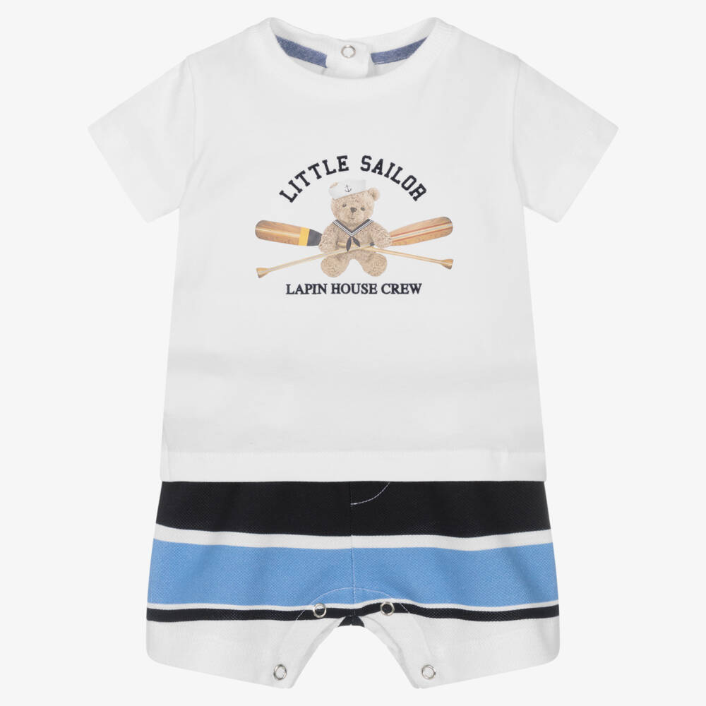 Sweet white and blue shorts set for baby boys, by Lapin House. Made in soft cotton jersey, the white crew neck tee has an adorable sailor teddy bear print on the front with the brand's logo. Fastening with poppers on the back, it pairs with matching striped shorts. Nautical-inspired, the cotton piqué striped shorts have a comfortable stretchy waist and fasten with poppers between the legs for a practical fit.
