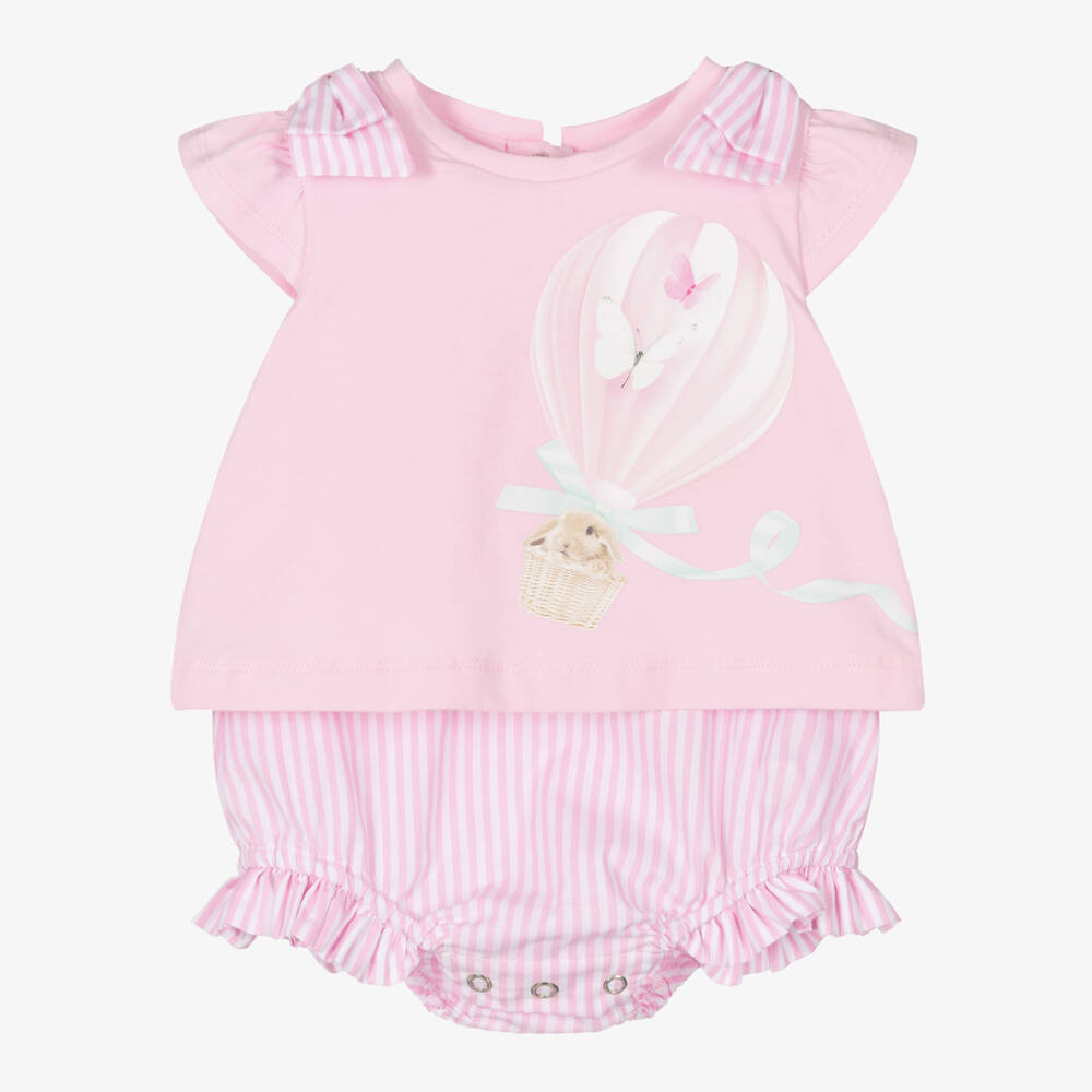 Sweet pink shortie for baby girls by Lapin House, made in soft lightweight cotton with a pink and white striped pattern. The cotton jersey overlay has matching pink and white striped bow trims on the shoulders and a cute bunny in a hot air balloon print on the front. There are popper fastenings on the back and between the legs.