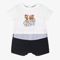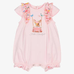 A sweet white shortie for baby girls by Lapin House, made in soft cotton jersey for a comfortable feel. Designed to look like a dress, the woven overlay is designed in pretty broderie anglaise with embroidered eyelets. Ribbon bows, stitched on each shoulder, are printed with pastel-coloured flowers for added charm.