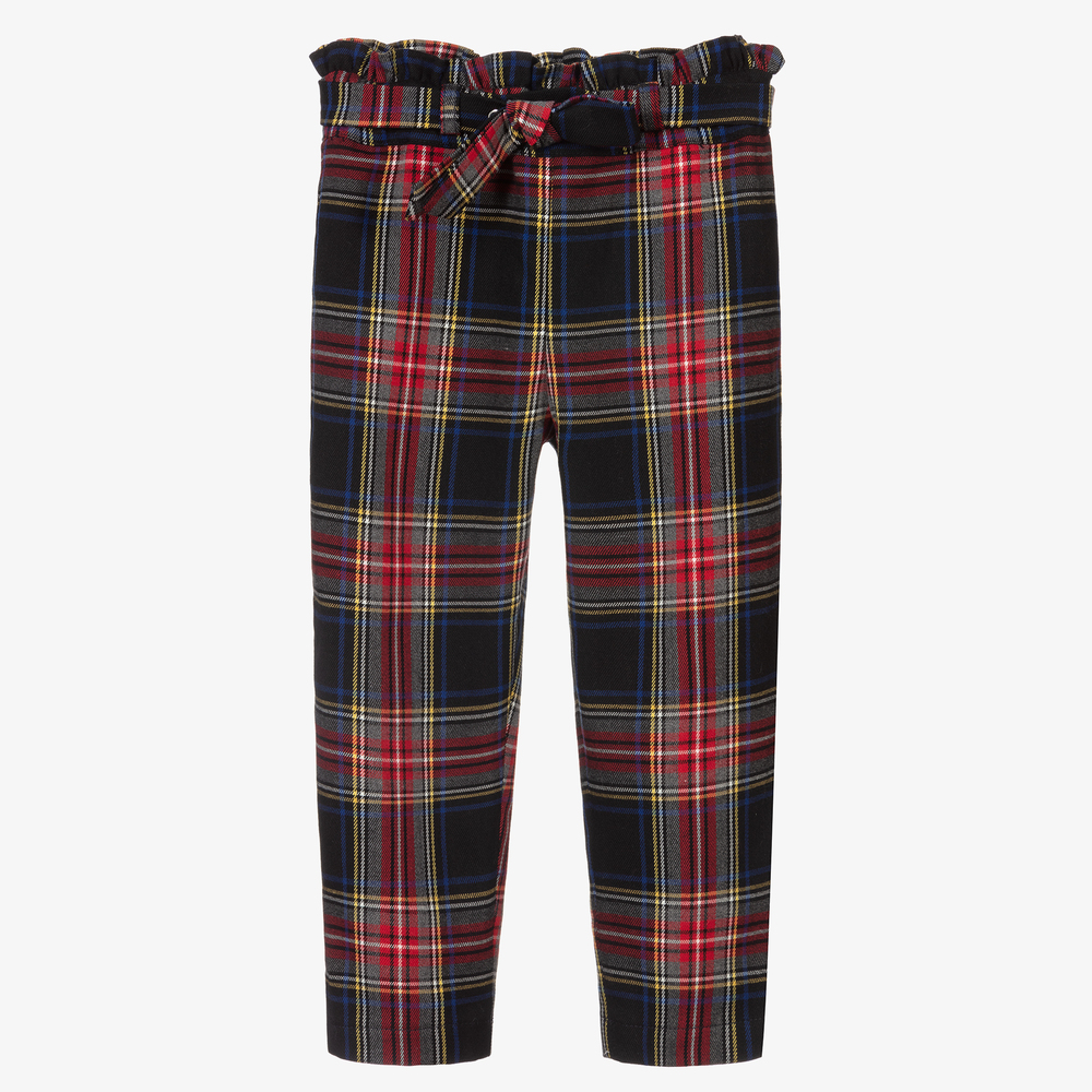 Girls red, blue and yellow tartan trousers by Lapin House, made in soft smart nylon jersey. They have a cute gathered waistband, a side zip fastening and a detachable tied belt that fastens together with poppers.