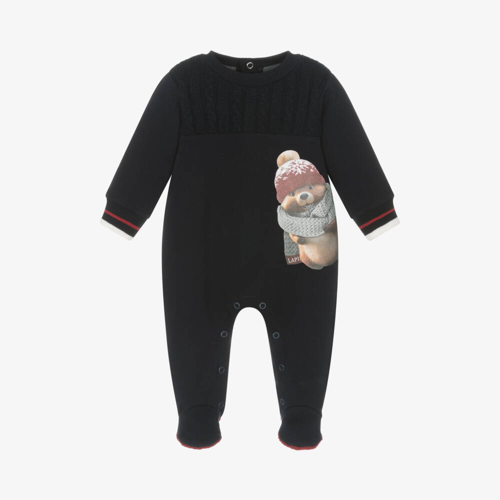 Fun navy blue babysuit for boys by Lapin House, with a cute chipmunk printed on the front, all dressed up for winter. Made in soft, comfortable cotton jersey, it has a knitted, cable-stitch bodice, with a coordinating, knitted back pocket in red. The ribbed cuffs are striped in red, white and blue, and there are popper fastenings on the back and between the legs for speedy changes. Smaller sizes have enclosed feet.