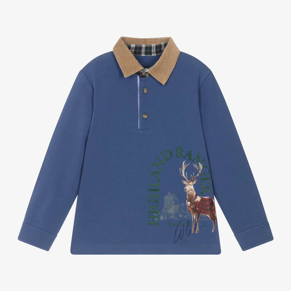 Blue cotton top for boys by Lapin House, designed in a smart polo shirt style. Made from soft jersey with a fleecy inside, this long-sleeved top features a 'Highland Ranger' deer design on the front. It fastens neatly with buttons and for stylish contrast, has a beige corduroy collar and blue and green tartan trims.
