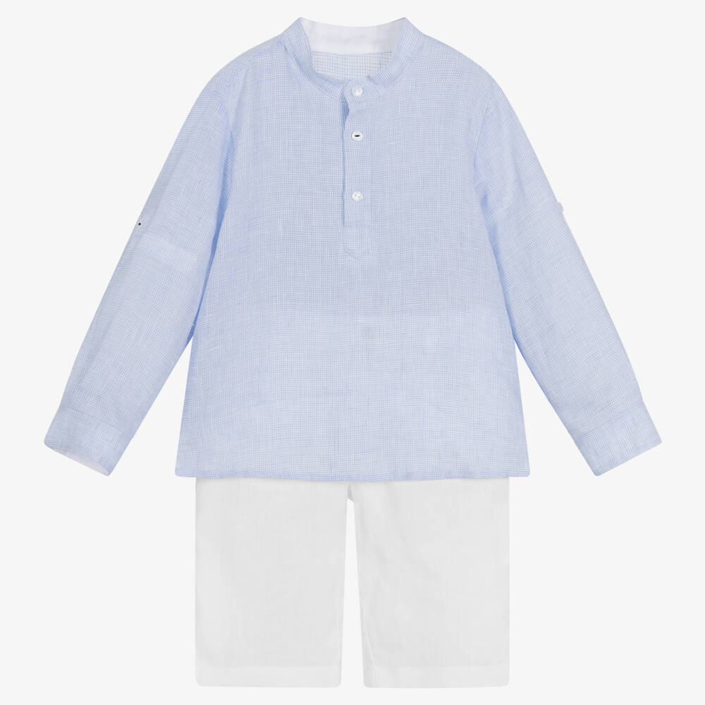 Smart and comfortable for warm days, this blue and white Lapin House shorts set for boys is made in lightweight linen. The collarless shirt has a fine checked weave, with a half button placket on the front, and sleeves that can be rolled up and secured with a tab. The shorts have pockets on the front and back, and an adjustable waist for a good fit.