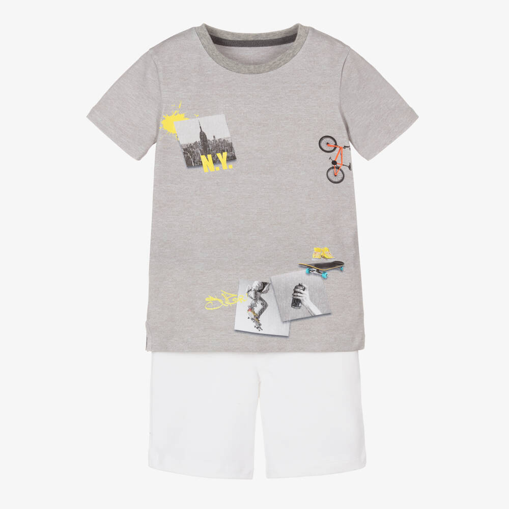 Grey and white shorts set for boys from Lapin House, made in soft cotton. The grey jersey T-shirt features a New York themed all-over print, with skateboards, BMX bikes, and graffiti. It comes with comfortable white shorts, made in mid-weight jersey with a stretchy grey waistband.