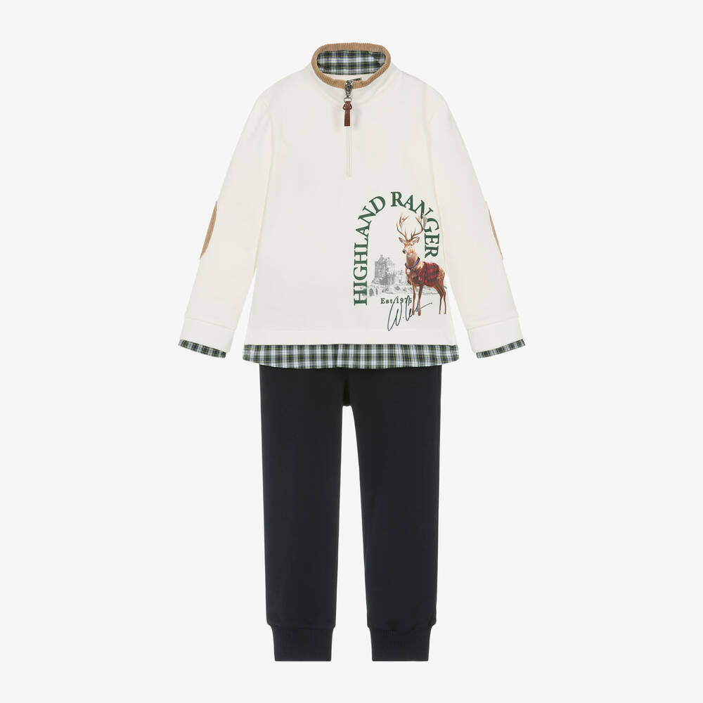 Boys casual ivory top and navy blue joggers set from Lapin House, made in soft mid-weight jersey. The half-zip top has a handsome Highland-themed print, with blue tartan trim on the cuffs, hem and lining the collar. The elbows have beige corduroy patches, coordinating with the edging on the collar. Ideal for comfortable wear, the joggers have a stretchy ribbed waistband and cuffs, with useful pockets on the front and back.