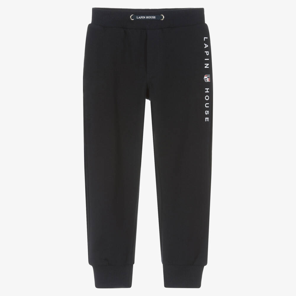 Navy blue joggers for boys by Lapin House, made in soft mid-weight cotton jersey with a fleecy inside. Great for casual days, they have a white logo print on one leg and further branding on the faux drawstring. There are concealed side seam pockets and extra pockets on the back. The elasticated waist and cuffs are lightly ribbed for a cosy feel.