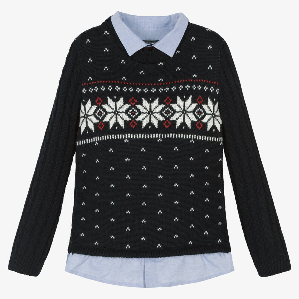 A classic navy blue sweater for boys by Lapin House, knitted in a white and red fair isle pattern. Great for smart-casual pairing, this cosy layer has cable knit sleeves and a light blue layered hem which appears like a shirt underneath. It has easy popper fastenings on one shoulder and split side vents for plenty of movement. The light blue, Oxford cotton collar can be removed from the neckline for versatility.