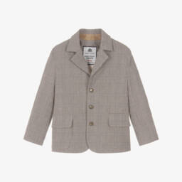 From Lapin House, a navy blue blazer for boys made in luxurious Milano jersey. This classic jacket has a preppy crest logo patch on the chest and crest embossed button fastenings for a smart look. It is finished with grey knitted cuffs adding a casual touch.