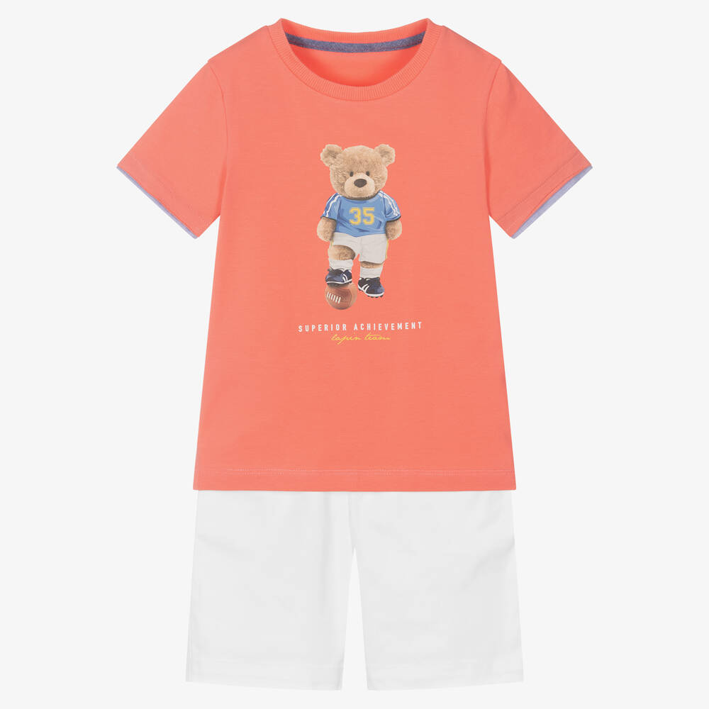Fun for boys, this coral pink and white cotton shorts set is by Lapin House. The pale coral pink jersey T-shirt has an adorable teddy bear football player print on the front. Fastening with shoulder poppers on smaller sizes, there are light blue Oxford cotton sleeve trims. The accompanying white twill shorts have four pockets and an elasticated waist for lasting comfort and a good fit.