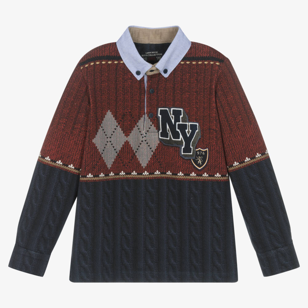 Dark red and navy blue polo shirt for boys by Lapin House, made in soft and stretchy cotton jersey with a fleecy inside. With a printed knit effect, this long-sleeved top features an 'NY' print on the chest with a logo crest badge. The light blue, woven collar gives this piece a smart-casual look, along with a striped, buttoned placket and a beige corduroy neckline.
