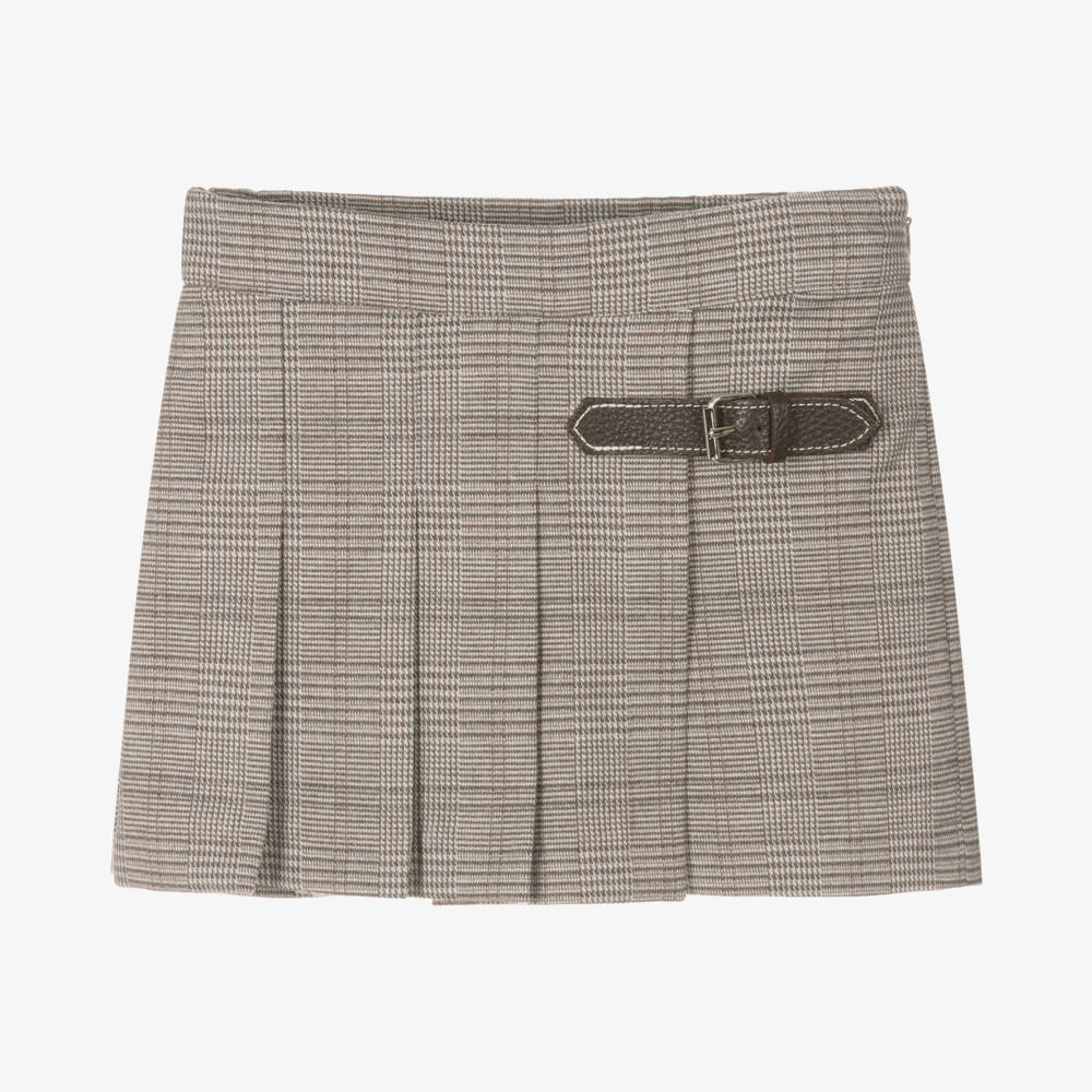 Dark beige skort for girls by Lapin House, made in a soft viscose blend. In a traditional check pattern, it has a pleated skirt front which secures with a leather buckle fastening. It has an adjustable waist and a concealed zip fastening on the side for a smooth finish.