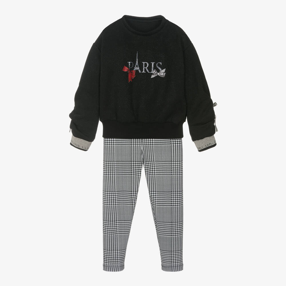 Stylish black sweatshirt and leggings set for girls by Lapin House, made in soft cotton-blend jersey. To elevate the casual style, the sweatshirt has a subtle glitter sparkle and a silver glitter Paris motif on the front. The sleeves are ruched, with logo tape trim that matches the print on the ribbed cuffs. An easy zip fastening on one shoulder helps with over-the-head dressing. It pairs with comfortable, stretchy leggings in an eye-catching Prince of Wales check.