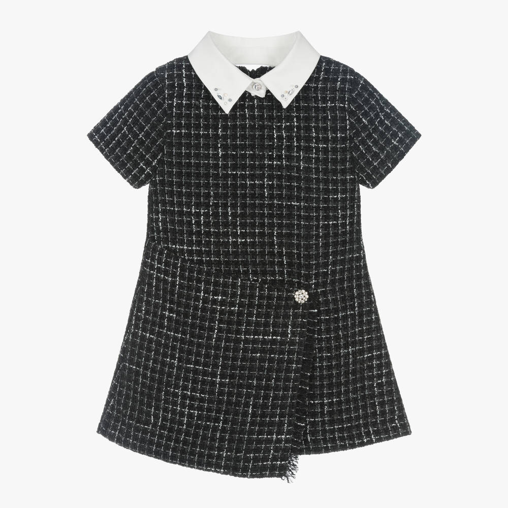 A black tweed dress for girls by Lapin House, woven with white yarn and glittery silver thread for a distinctive, textured look. Lined with cotton fabric, it has short sleeves and a detachable white twill collar that fastens inside the neckline with discreet buttons. It has a wrap-style detail, stitched in place on the skirt, creating an asymmetric hemline. Silver beads and a diamanté flower button on the front add pretty finishing touches to this zip-up dress.