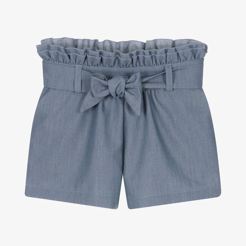 Timelessly stylish blue cotton chambray shorts for girls by Lapin House. Tailored for a smart look, they have a frilled waistband which is elasticated around the back for a comfortable fit. The shorts have a detachable sash belt that ties in a pretty bow on the front and useful, jetted side pockets.