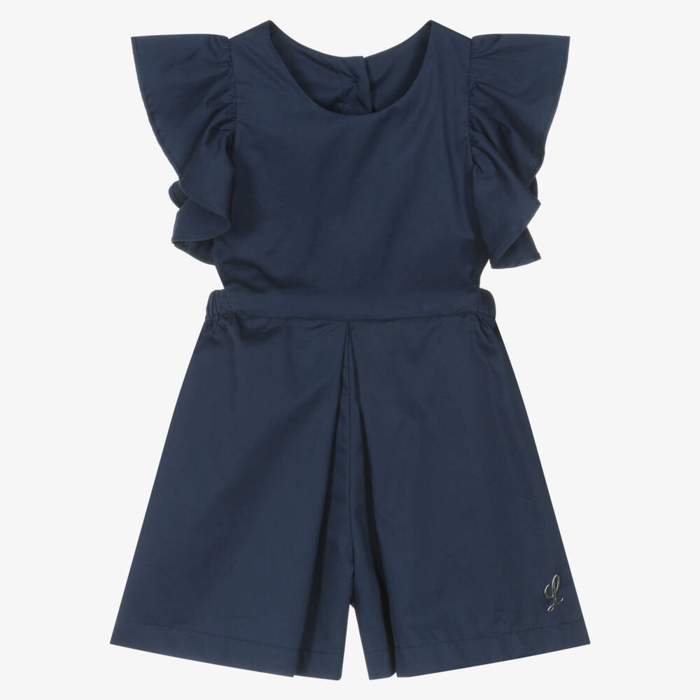 Navy blue playsuit for girls by Lapin House, made in soft, smooth cotton sateen. It features ruffled short sleeves and a stylish open back with button fastenings and an elasticated waist for a great fit. It has a pleat on the front of the shorts for a tailored look and a silver logo charm on one leg for a branded finish.