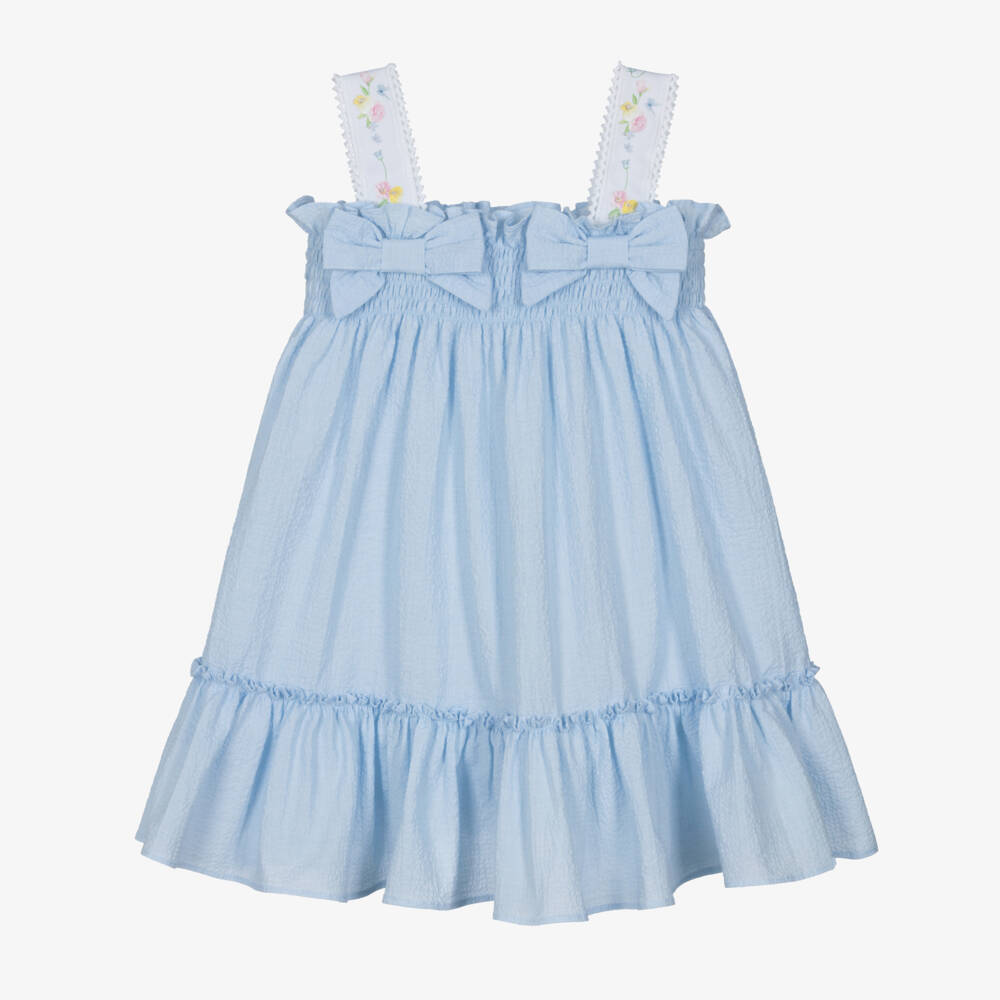 Pretty blue sun dress for girls by Lapin House, made in soft cotton seersucker. Ideal for warmer days, the bodice is shirred for a comfortable fit, with bow trims on the front. There are white shoulder straps, trimmed with lace and patterned with colourful florals and diamantés for a pretty finish.
