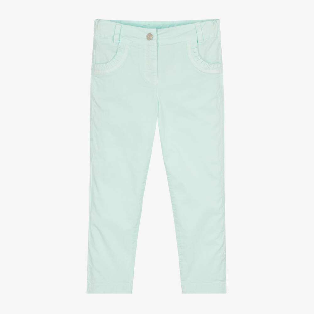 Pale turquoise blue cotton trousers for girls by Lapin House. Smooth and lightweight with a slight stretch for comfort, they have pretty ruffle details on the pockets for a feminine touch. They fasten with a button on the front and the waist has an adjustable waistband for a better fit.