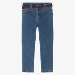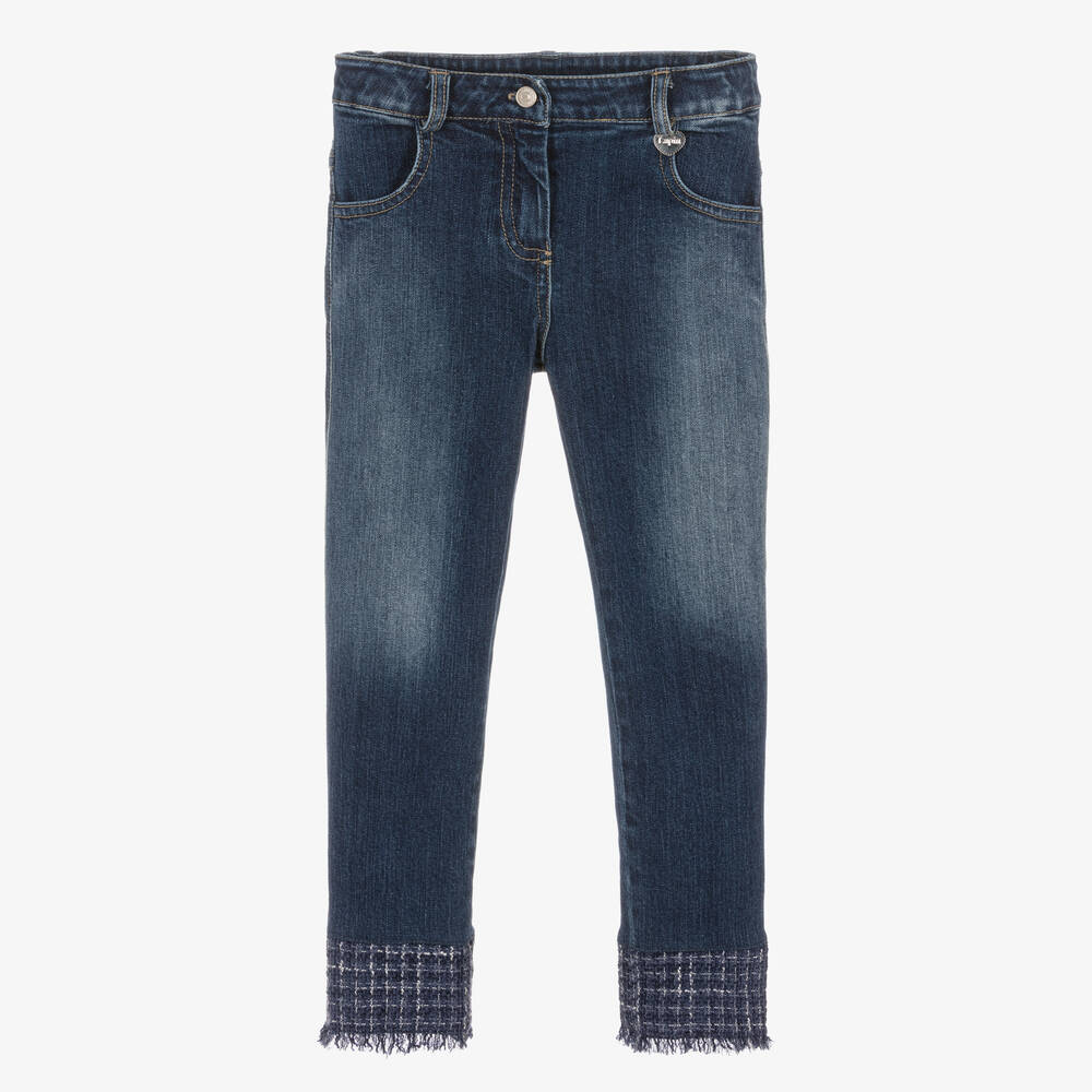 Dark blue washed denim jeans for girls by Lapin House, with a slight stretch for comfort. Adding a stylish twist to a casual design, the hem of the jeans are made in soft tweed with frayed edges. There are useful front pockets and matching tweed patch pockets on the back, with a button and zip fastening and adjustable waistband for a comfortable fit. Smaller sizes simply pull on. A silver heart-shaped logo charm can be seen on the front adding that signature finishing touch.