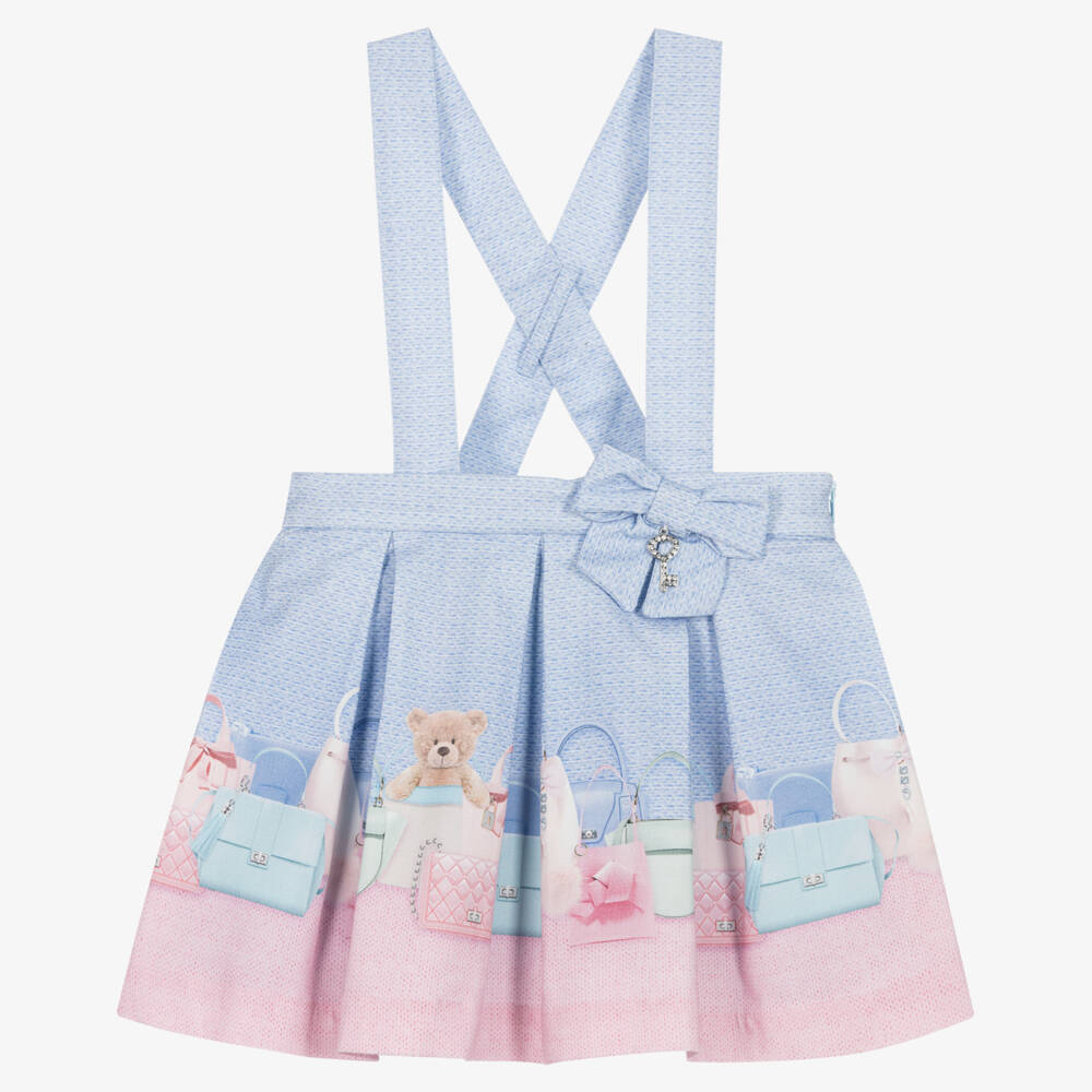 Sweet blue pleated skirt for girls by Lapin House, made in soft and stretchy brushed cotton. It has a lightweight cotton-blend lining and a pink, blue and green handbag print with cute beige teddy bears. It has adjustable shoulder straps, which attach with buttons at the front and a fixed bow on the front with a sparkly diamanté key charm. There is a useful adjustable waist and a zip fastening on the side.