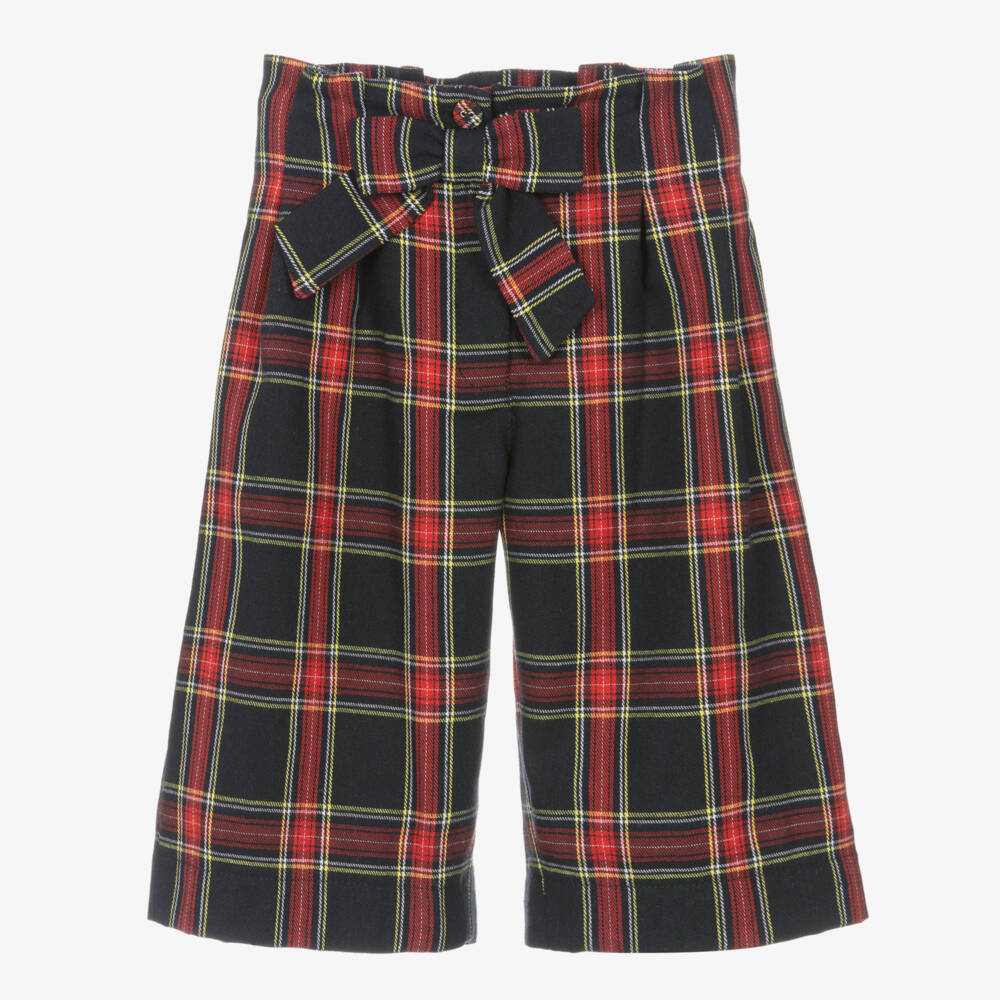 Navy blue cotton culottes for girls from Lapin House. Slightly cropped, these wide-leg trousers are woven in soft twill, with a red, white and yellow tartan pattern for a traditional look. Structured and darted for shape, they have an adjustable waist for comfort and a decorative bow on the front. They fasten with a hidden button and zip on the front for a neat finish.