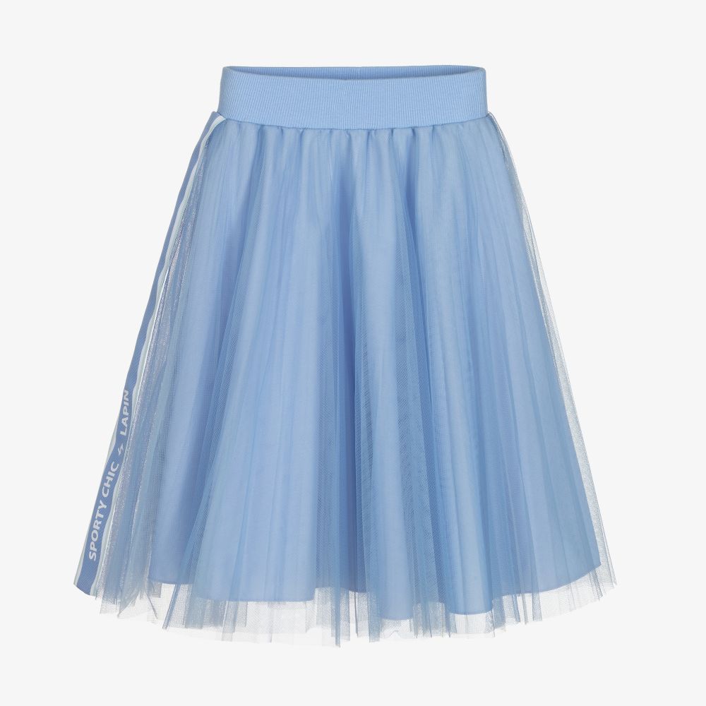 Girls pretty pale blue midi skirt by Lapin House. Gathered and flared, it is made in layers of tulle, with a cotton lining for comfort and an elasticated waistband. There is a blue and white striped grosgrain band down one side, with 'Sporty Chic by Lapin' printed on it in white.