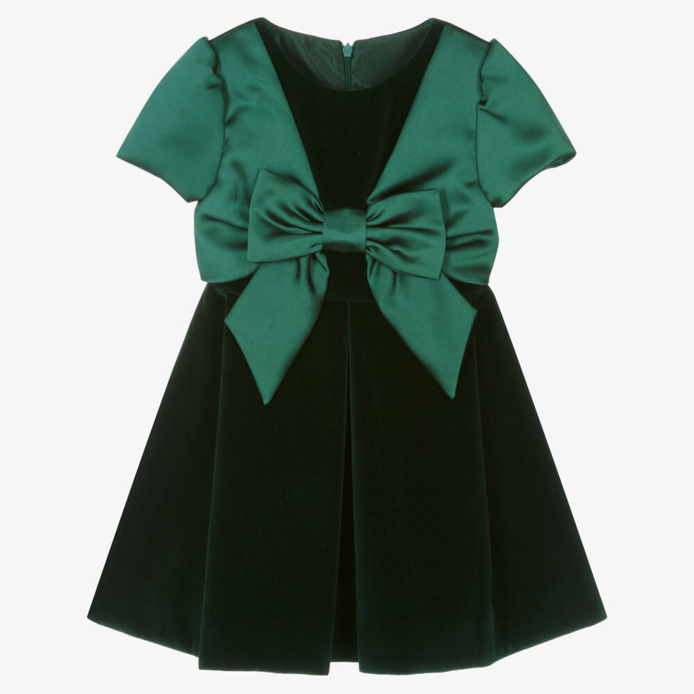 Gorgeous forest green velvet dress for girls by Lapin House. This elegant design is accentuated with a bolero-style satin overlay, puffed sleeves and a large bow detail at the front. Box pleats on the skirt create a beautifully voluminous shape. It is fully lined for comfort and fastens with a discreet zip on the back for a neat finish.