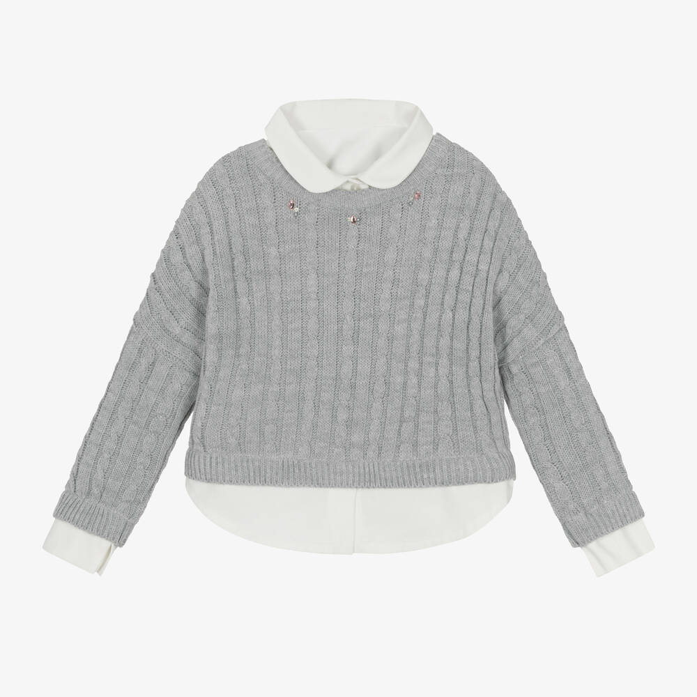 Grey cable knit sweater for girls by Lapin House, designed to look like a double-layered top. Made in lightweight twill, the collared neckline has a button fastening panel concealed beneath the bodice of the sweater, with a matching trim on the cuffs and shaped hemline. Pink, grey and silver beads decorate the front, adding a subtle touch of sparkle.