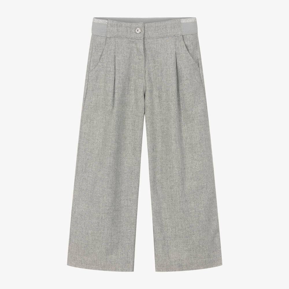 Grey trousers for girls by Lapin House, made in a cotton and viscose blend with a soft brushed feel. These casual trousers have an all over glittery effect, with pleats and slanted pockets on the front. The waistband is elasticated at the back with a gilttery silver trim for added sparkle. Comfortable and casual, they fasten with a button and zip on the front.