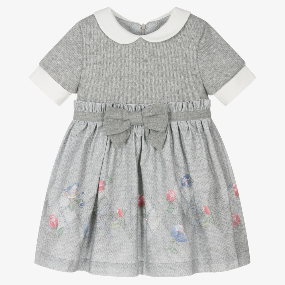 A delightful grey dress for girls by Lapin House. The bodice is knitted with a touch of silver sparkle and white twill trims. The woven skirt has a unique argyle knit effect print with flower and bird motifs and sparkly diamantés. It is ruffled and gathered around the waist with a shimmery grey bow trim on the front. For added comfort, the dress has a lightweight cotton lining and a practical zip to fasten seamlessly on the back.