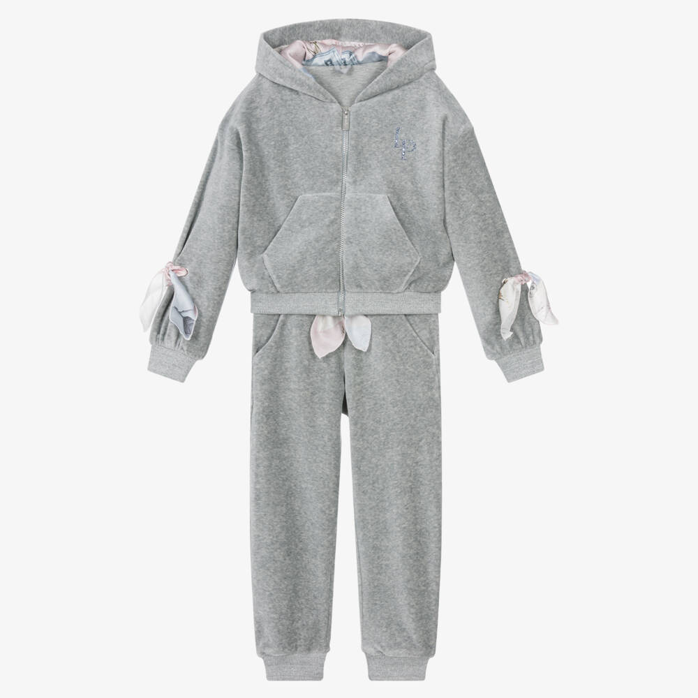 A light grey cotton tracksuit for girls by Lapin House, made from super plush velour. Casually glamorous, the zip-up hoodie has a glittery logo printed on the chest, with vintage-effect satin bows attached to the sleeves. There are cosy pockets on the front and sparkly elasticated trims for added allure. It pairs comfortably with the matching joggers, which are finished with a faux drawstring and side seam pockets.