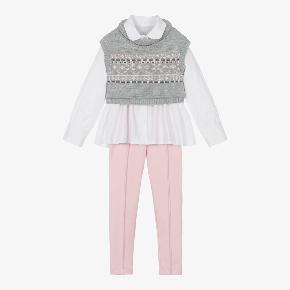 A stylish pink, grey and white outfit set for girls by Lapin House. The long-length blouse is made in smooth cotton poplin and has a pretty flared silhouette. It has button fastenings, including a diamanté button at the neck and on the cuffs. The Milano jersey leggings are smartly seamed down the front, with an elasticated waist for a comfortable fit. A grey knitted slipover, with a pink and grey pattern across the front, completes the outfit. It has a cowl neck and is embellished with sparkly diamanté and faux pearls.
