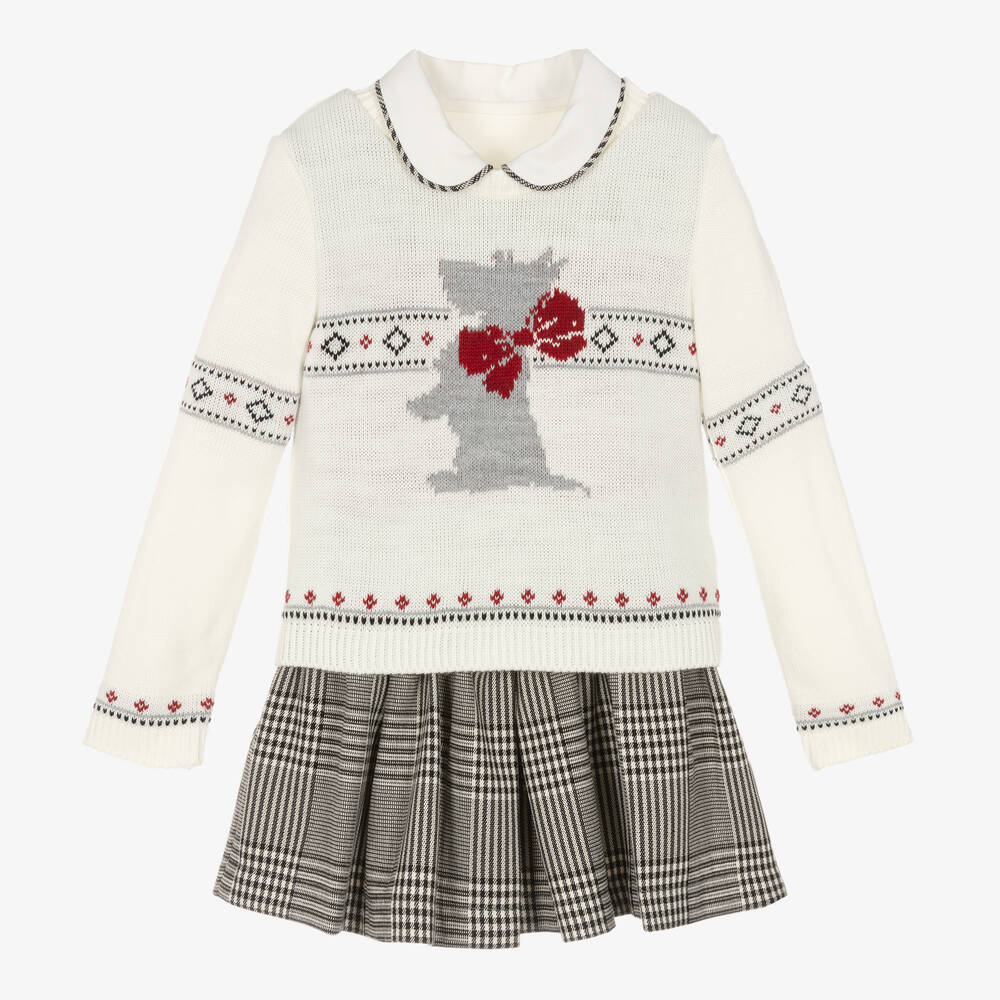 A lovely dress and sweater set for girls by Lapin House. The dress has a white jersey bodice and a short button placket. Gathered for a flared silhouette, the skirt is woven in soft fabric and patterned in a black and white houndstooth check. Adding a cosy extra layer, the dress comes with a softly knitted ivory sweater, which has black and red patterned trims and features a cute Scottie dog motif on the front.
