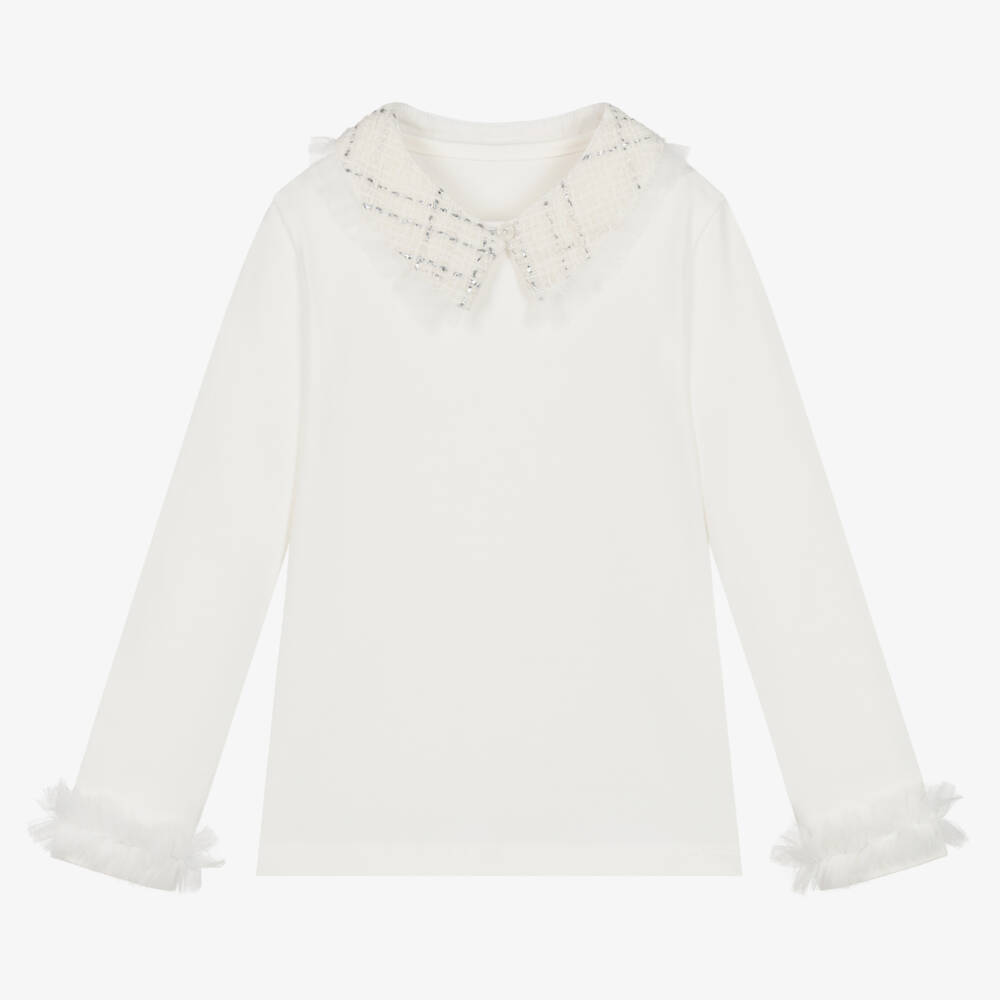A gorgeous ivory top for girls by Lapin House, made in soft and stretchy cotton jersey. Designed to suit all occasions, this classic top is transformed with a pointed, tweed collar. It is decorated with sparkly silver thread and tulle trims which coordinate beautifully with the cuffs. With a dainty button in the middle, the collar can be opened to help with dressing.