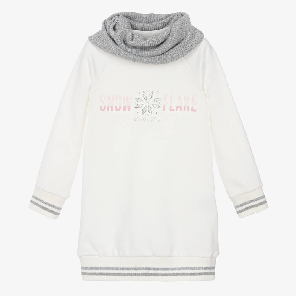 Ivory cotton sweatshirt dress set for girls by Lapin House, with a sparkling diamanté snowflake on the front, glittery pink and silver script. Made in soft, comfortable jersey with a warm, fleecy inside, the ribbed trims have glittery silver and grey stripes, matching the cosy, glittery grey snood.
