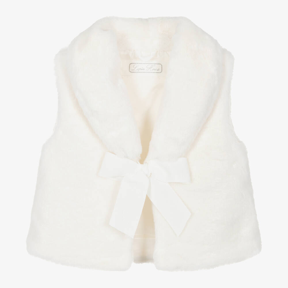 A lovely ivory gilet for girls by Lapin House, made in beautifully soft faux fur. A snug extra layer, it is lined with silky smooth fabric and styled with an oversized collar. It ties with colour-matched grosgrain ribbon, creating a lovely bow on the front.