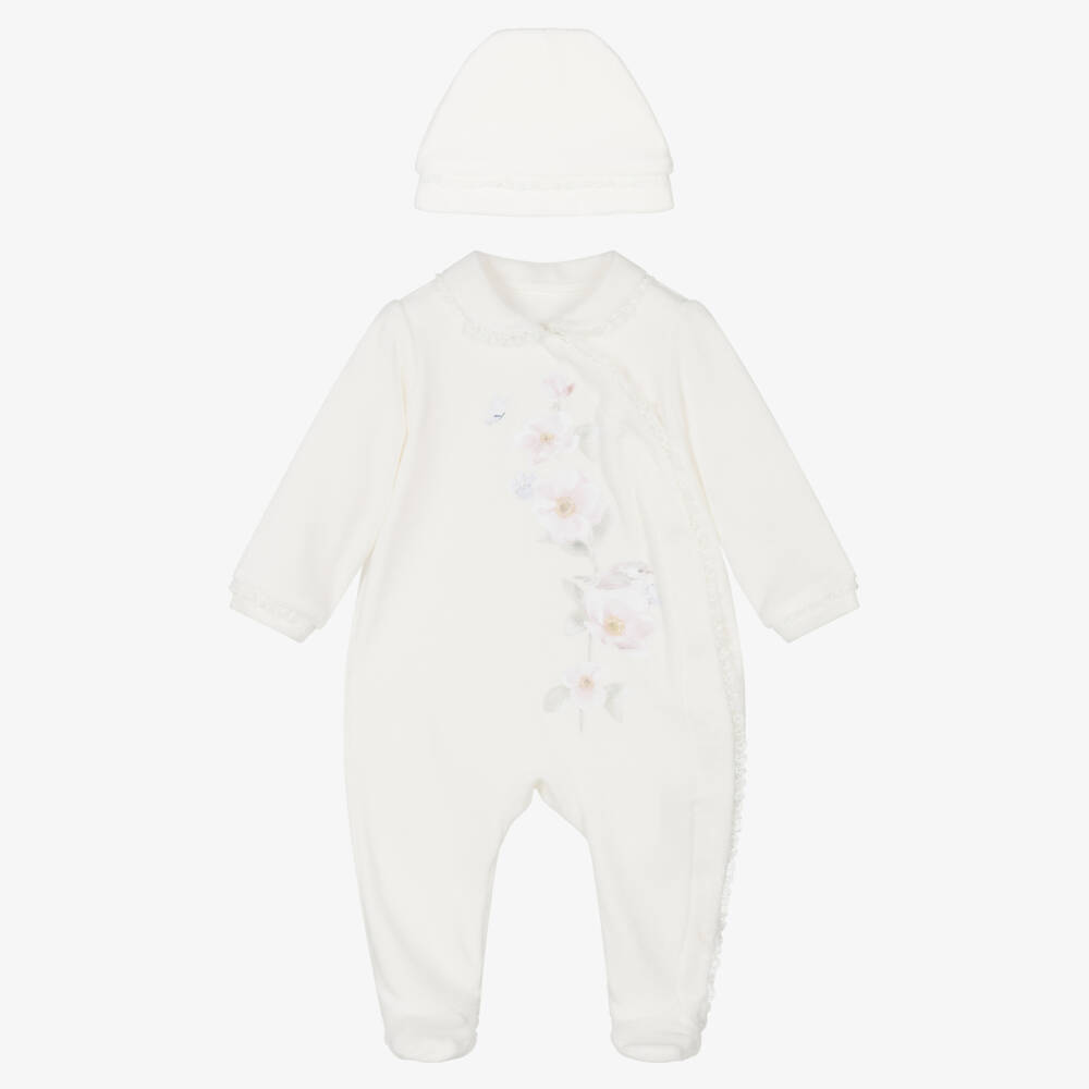 Ivory babygrow and hat set for girls by Lapin House. Made in a luxuriously soft cotton velour, the babygrow is detailed with scalloped lace trims and a sweet rounded collar for a classic-inspired look. Decorated with a beautiful pastel floral print on the front, it fastens with poppers for quick and easy dressing. The matching double-layered hat completes the outfit.